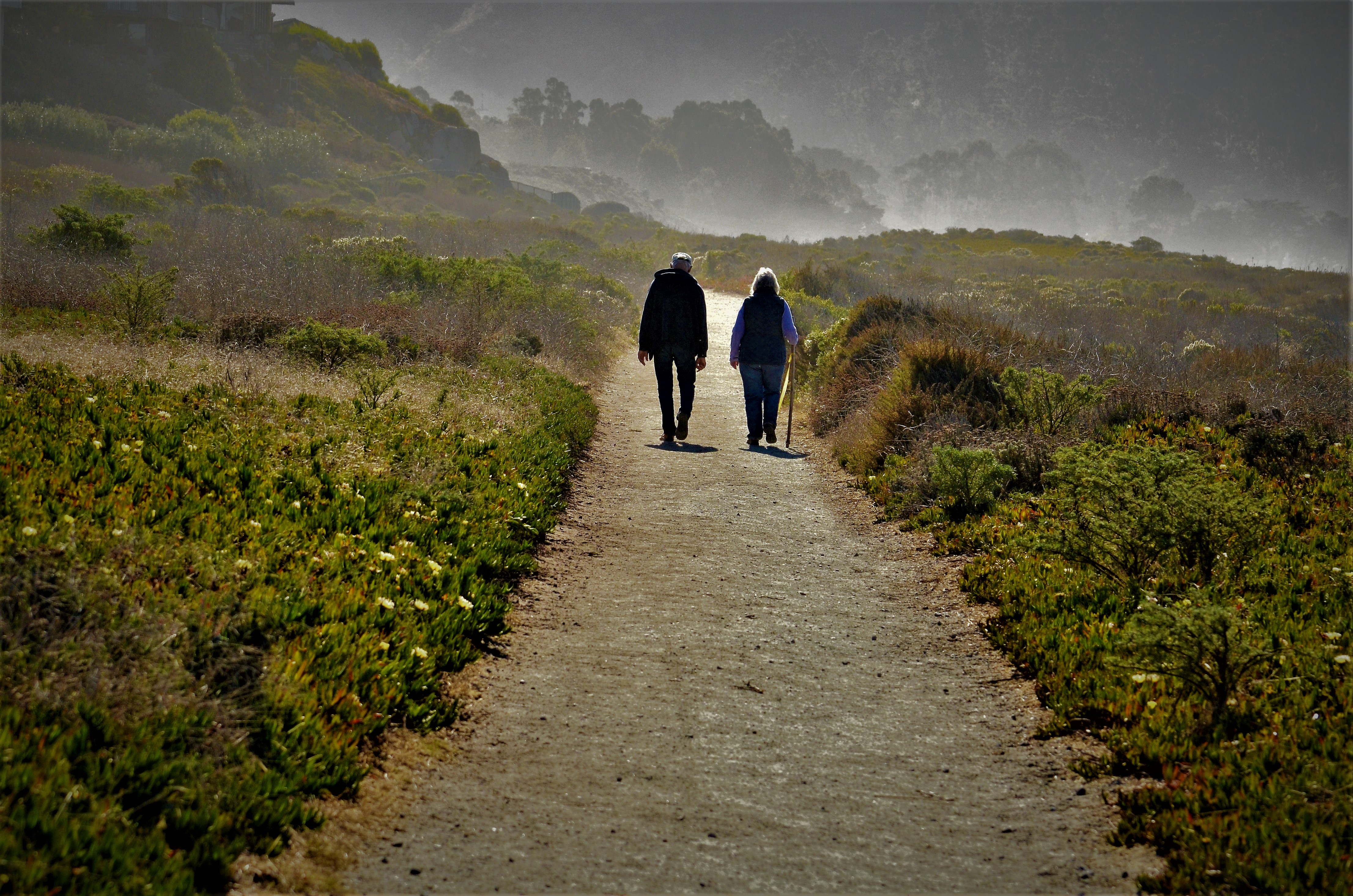 An elderly couple walking towards the fog along the Monterey Coast. Peace.