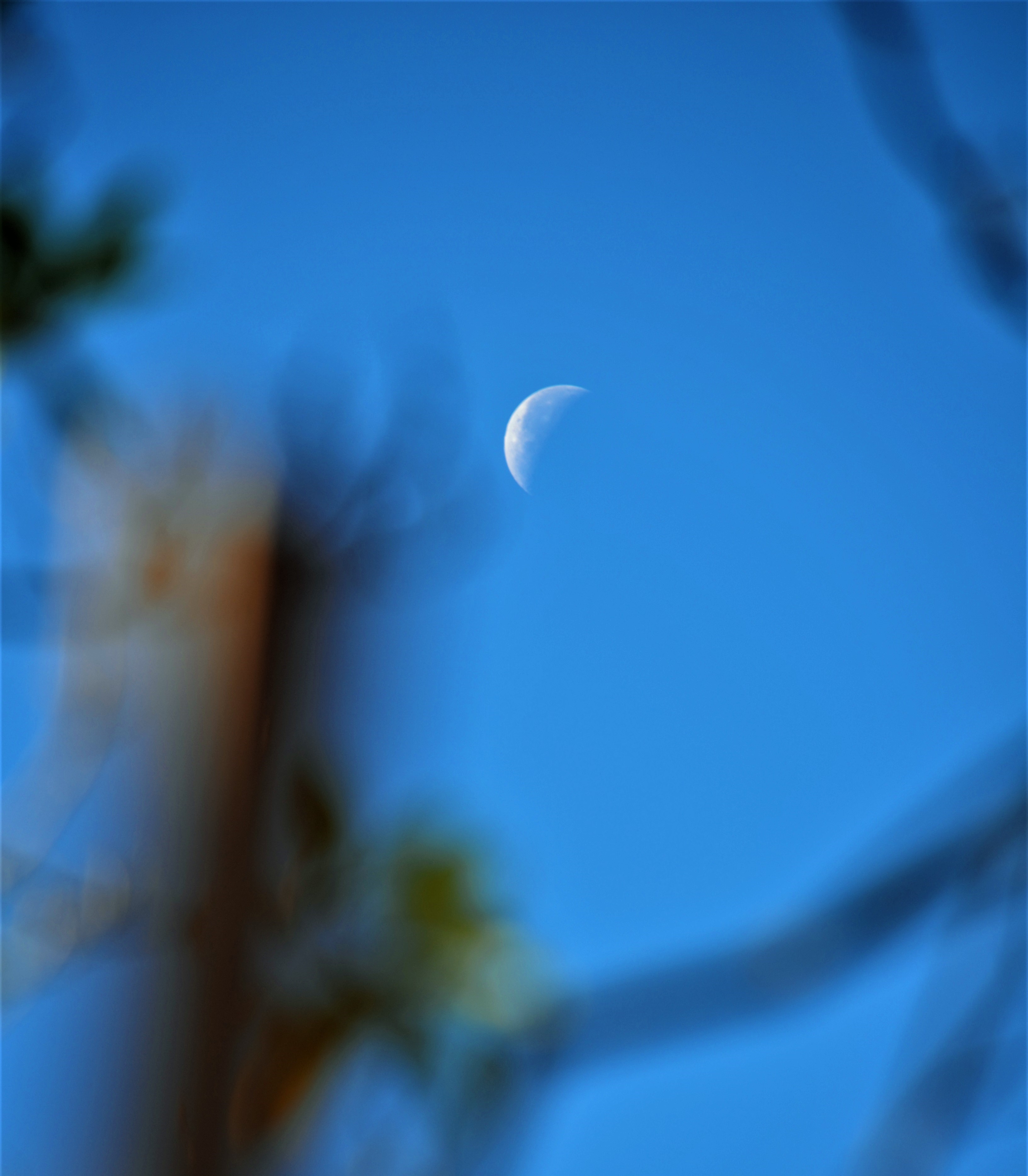 Yesterday around 10:30 a.m. I was pruning a tree when I realized I was looking at the moon in clear skies. Dropped the shears and got the camera–needed a break anyway–for this shot.