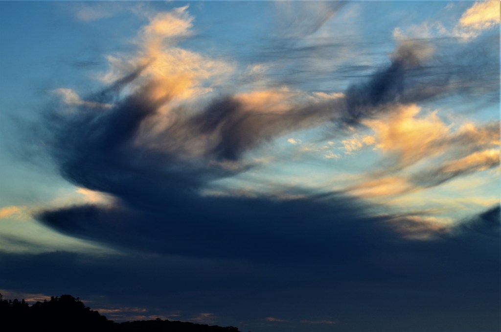 Yesterday about five minutes before sunset, there was no sun visible on the horizon; instead, the sky above the dark clouds exploded with light for a few minutes before fading to black.