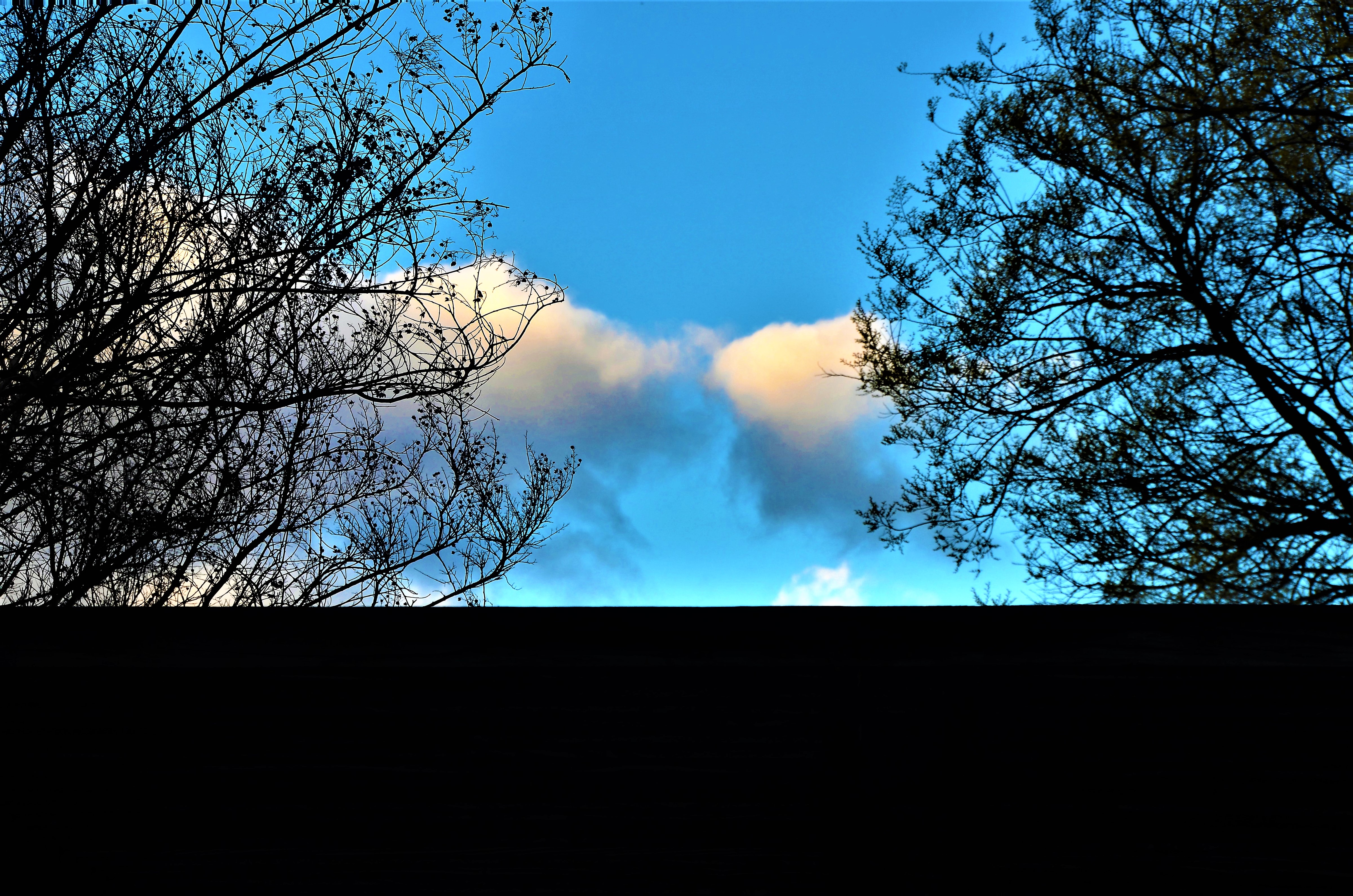 Sometimes it helps to frame a photo. I took this shot yesterday in my backyard looking over the roof of our house at clouds “meeting” between two bare branched trees.