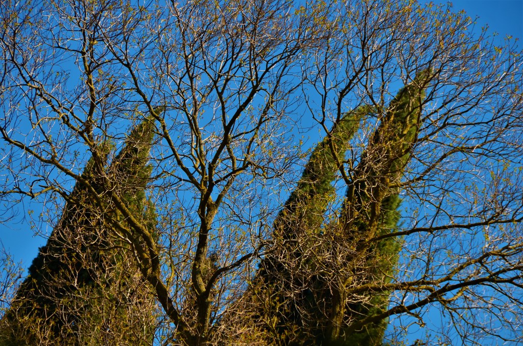 Another gusty day in Sacramento where I captured a neighbor’s Italian cypress trees, two houses down, bending in the wind as seen through a budding hackberry tree.