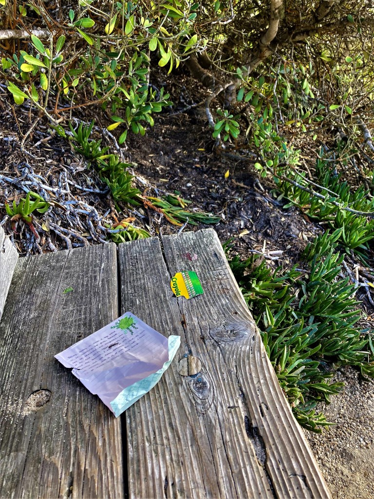 Yesterday while walking Leo I found a “note” resting on a bench overlooking Carmel Bay. Notes are often left here, in fact there is a mailbox under the bench for visitors to leave written thoughts. Also left was a torn top of a crayon box–again, kids leave their seaside artwork for others to enjoy. I assume these “clues” were left recently as the ocean winds would normally blow them away. I read the nameless visitor’s message about how it is “hard” be alone. This morning I read that 26 million people over the age of 50 in this country live alone and that prompted me to leave this post.
