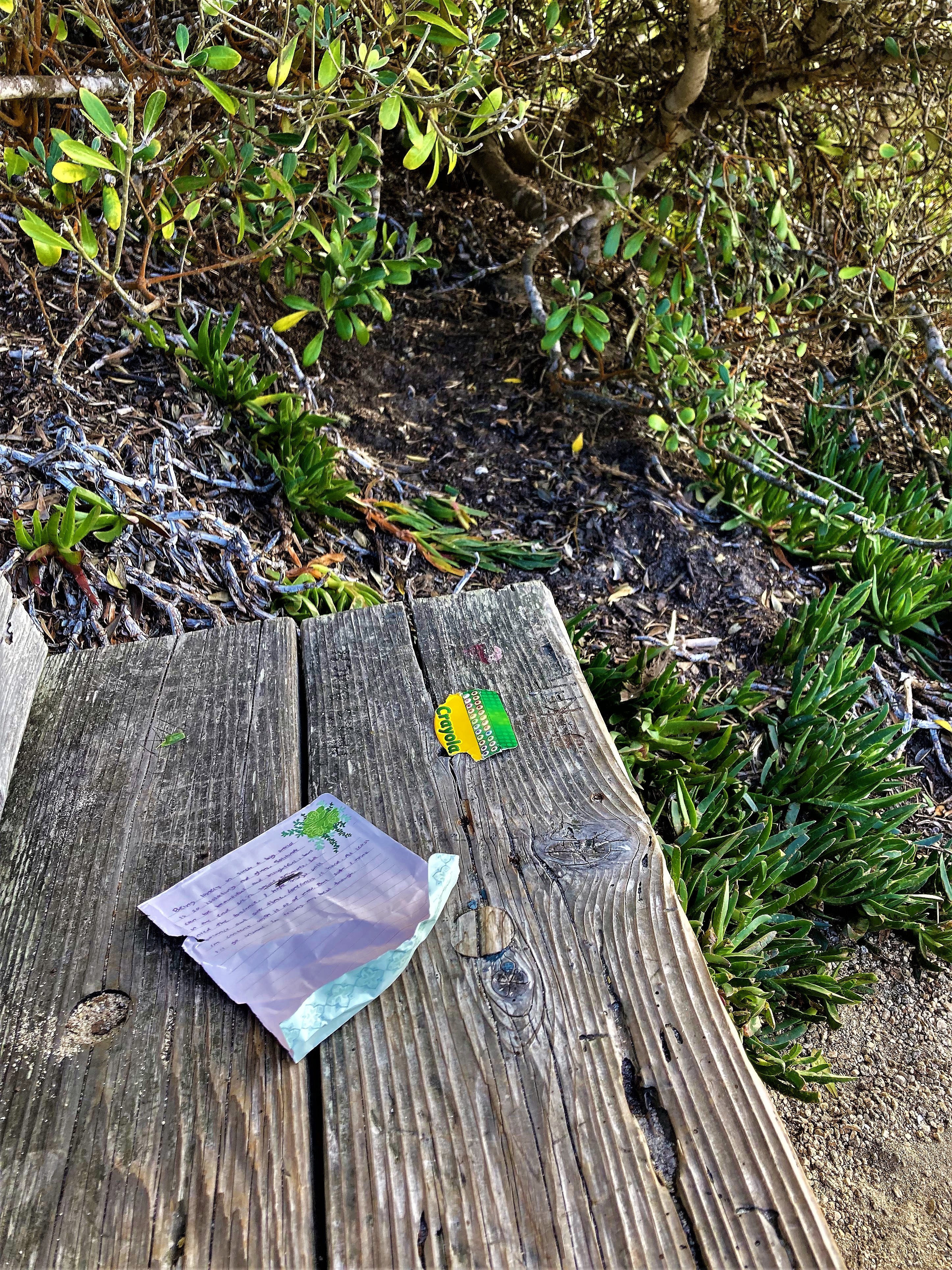 Yesterday while walking Leo I found a “note” resting on a bench overlooking Carmel Bay. Notes are often left here, in fact there is a mailbox under the bench for visitors to leave written thoughts. Also left was a torn top of a crayon box–again, kids leave their seaside artwork for others to enjoy. I assume these “clues” were left recently as the ocean winds would normally blow them away. I read the nameless visitor’s message about how it is “hard” be alone. This morning I read that 26 million people over the age of 50 in this country live alone and that prompted me to leave this post.