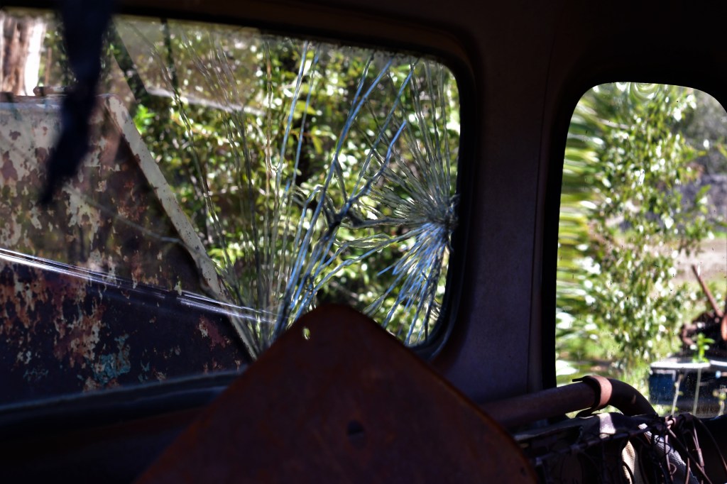 The inside of an old, smashed-upped pickup truck.