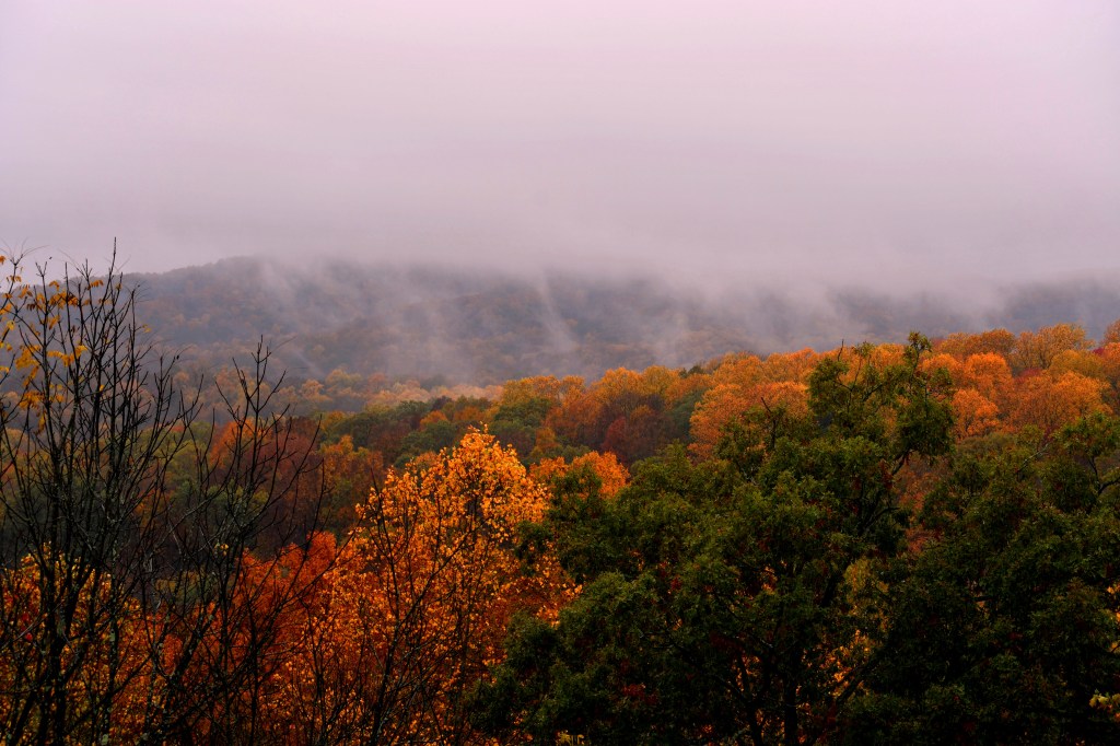 I took this photo in late October somewhere in Southern Illinois with a gentle fog clearing in the distance. The fall colors are peaking in Northern California this week, but the colors were in full bloom three weeks ago in places like the Shawnee National Forest.