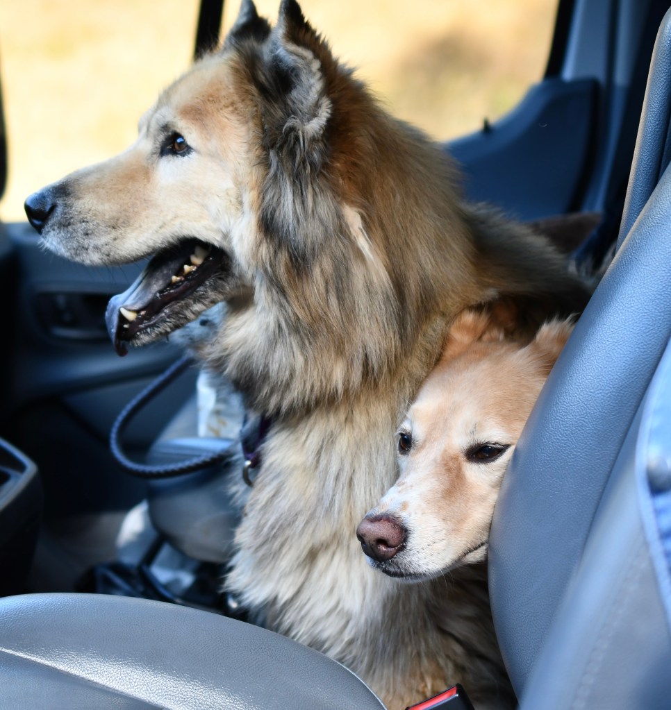 We are a camping pack: two adults and three dogs. Here Leo (black tongue) and Molly take over the front of our Ford Transit during a stop in Yosemite.