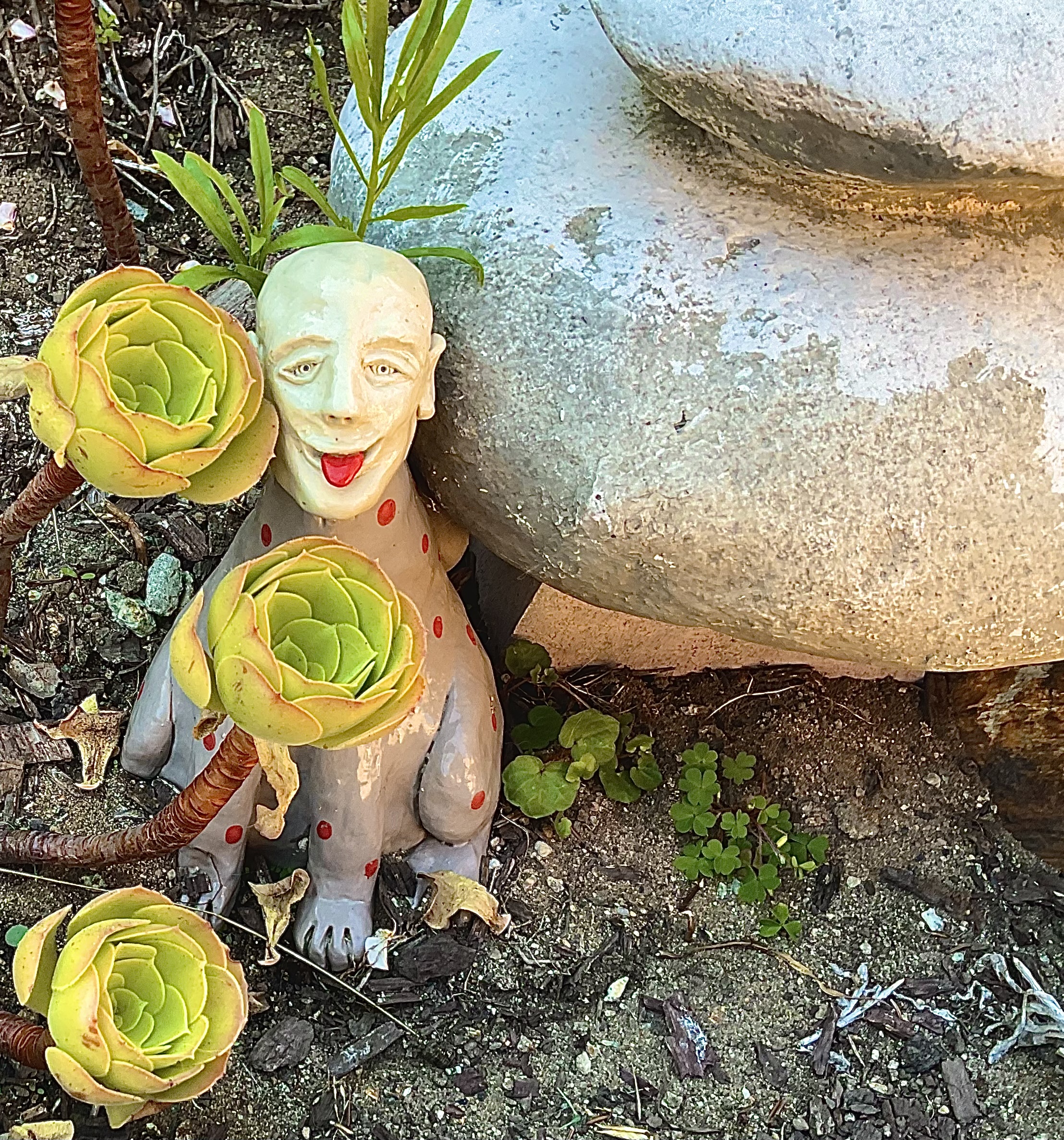 I didn’t like this ceramic figure, in a word, it was…strange. Eventually, we put it outside in various locations until we forgot about it. Then one day when I was surveying the gopher holes in the garden, I saw this bright red tongue and LAUGHED. This guy was a survivor…and the succulents have grown to like him!