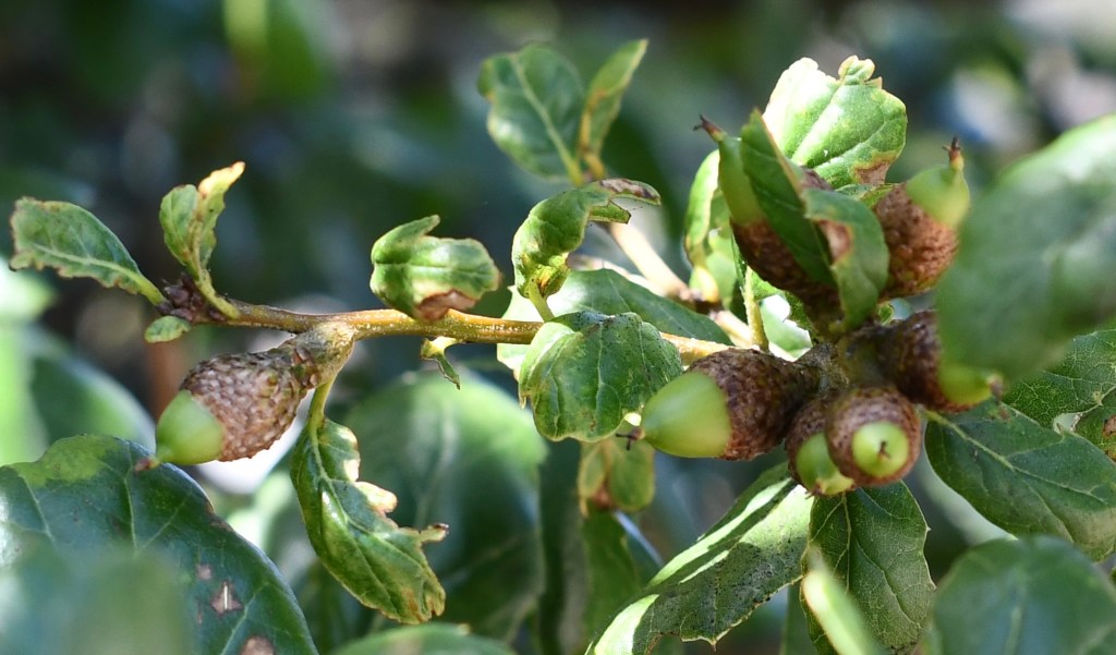 Twelve years ago I planted a coastal oak in the front yard to replace an oak that had succumbed to bark beetles. It was about six-feet tall, dwarfed by its ancient predecessor. With each passing year the little oak stayed just that, a little oak. However, this Spring I noticed the oak was having a growth spurt—it seemed to have grown three feet in a few months and overall it was a good 15 feet high. Then last week I noticed there were small green acorns on the lower branches. I had read that acorns aren’t produced until the tree is 15 to 20 years of age. Wake up call: the tree has grown up.