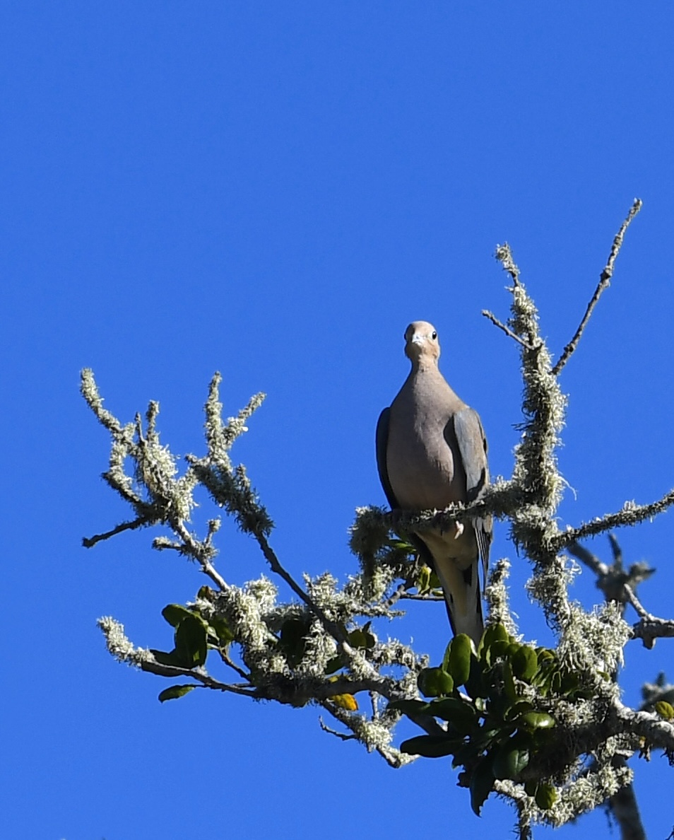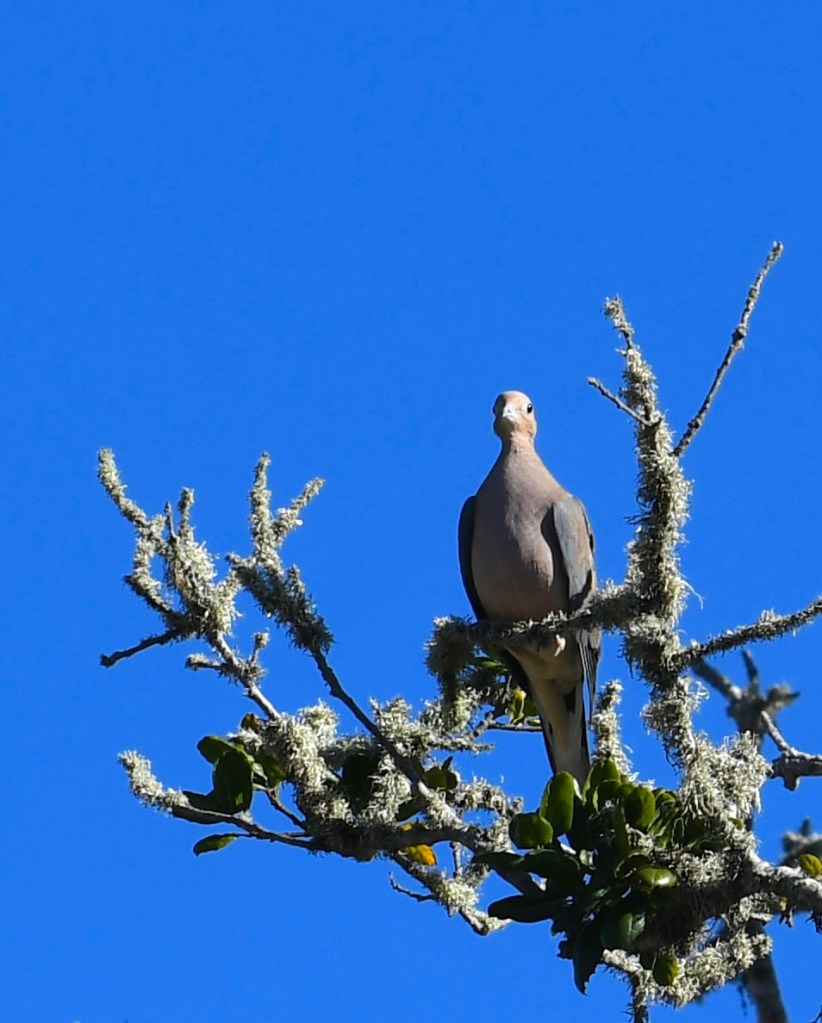 At first sight the bird high up in an oak tree was a very large mourning dove, but on closer inspection it was a rock pigeon, according to my bird app…hardly scientific.