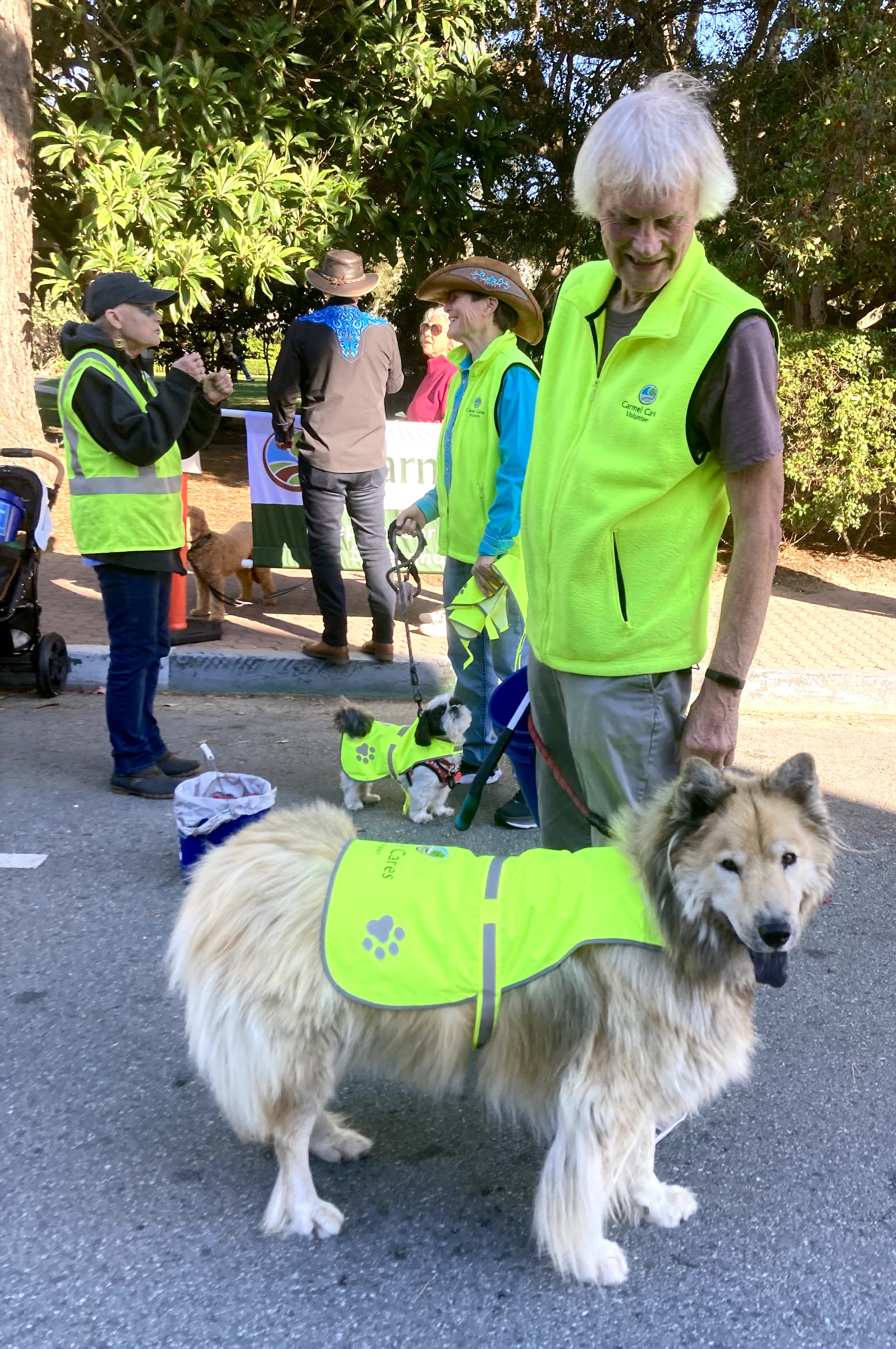 Despite the crowds and the noise, Carmel’s annual Halloween Parade down Ocean Avenue was no problem for Leo yesterday. He was aware of his surroundings and fixed on leading his group. The key to his behavior was the fact there was another dog about his size in the parade. Several times during the march the two touched snouts, an exchange of confidence. There were about 80 people and a handful of dogs in our group wearing neon yellow vests with the lettering, Carmel Cares volunteer. We pick up trash in the town and on the beach.