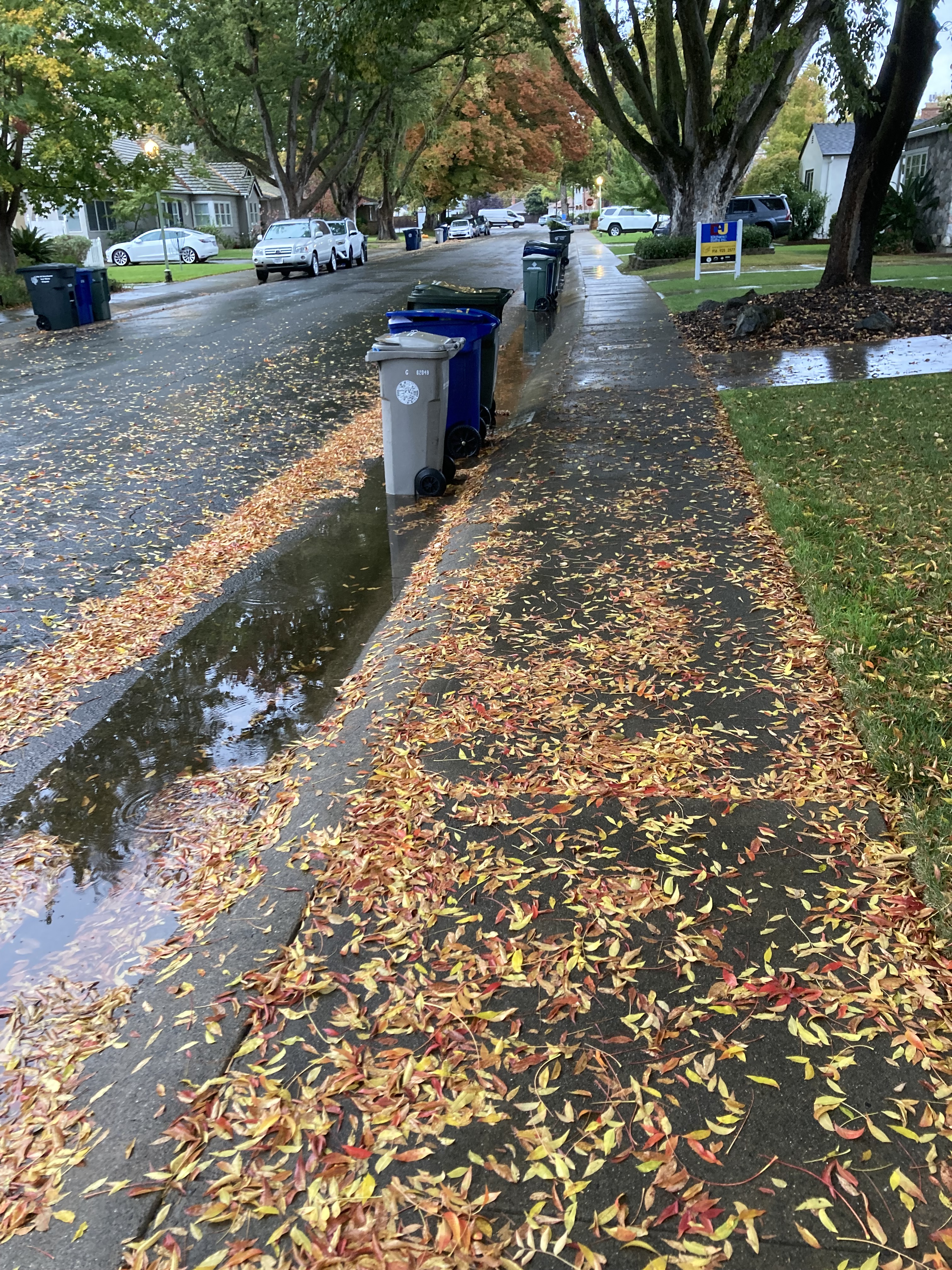 We had a morning rain in Sacramento, pinning leaves to sidewalks. The elections are over for now while it’s Garbage Day in the neighborhood. More coffee required.
