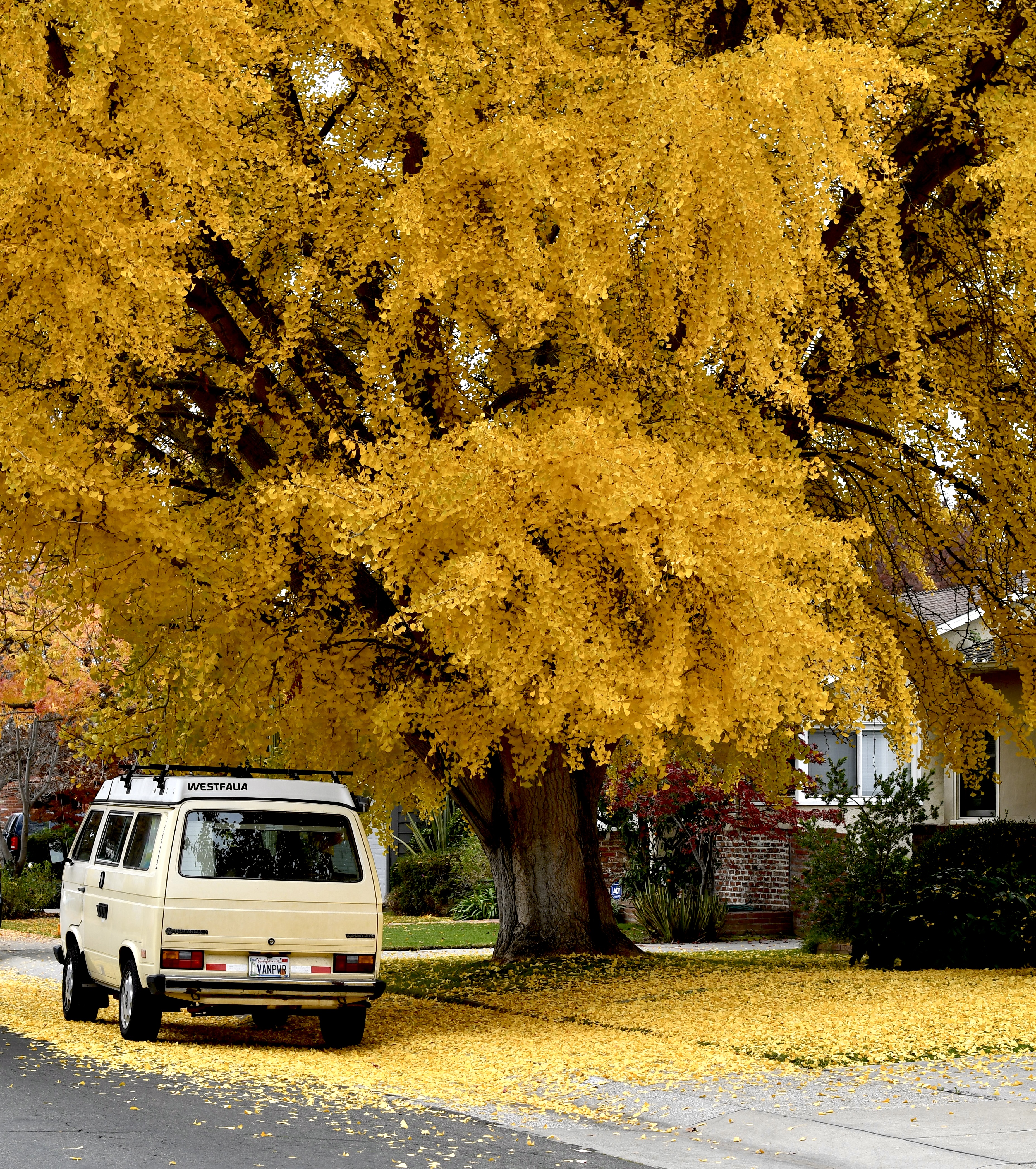 In Sacramento ginkgo trees are the last to lose their leaves. Yesterday the ginkgoes were in full grandeur, a spectacular yellow. So, I decided to park my 1984 Vanagon under a ginkgo to see how its faded yellow paintp compared to Mother Nature’s work. Of course, there was no comparison.